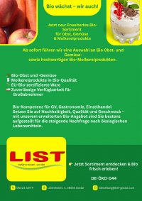 Obst & GemüseBestellungen immer Dienstags bis 10:30UhrAnlieferung Mittwoch bei ListBIO Apfel10kg KisteBIO Aprikosen3kg KisteBIO Bananen18kg KisteBIO Birnen6kg KisteBIO Cherrytomaten8 x 250g SchaleBIO Eisbergsalat8er KisteBIO Gurken 35/4012er KisteBIO KIWI104er KisteBIO Möhren 10kg10kg KisteBIO Nektarinen gelb3kg KisteBIO Paprika Gelb5kg KisteBIO Paprika Rot5kg KisteBIO Pflaumen rot3kg KisteBIO Radieschen10 BundeBIO Romanasalat8er KisteBIO Strauchtomaten6kg KisteBIO Tomaten rund6kg KisteBIO Wassermelone18kg KisteBIO Weintrauben Blau6kg KisteBIO Weintrauben hell5kg Kistefrische ArtikelBIO Emmentaler Scheiben 48% 500gPckg. Frischpack10x500gPackungBIO Edamer Scheiben 48% 500gPckg. Frischpack10x500gPackungBIO Gouda Scheiben 48% 500g Pckg.Frischpack10x500gPackungBIO Gouda gerieben 10x1kgFrischpack10x1kg BeutelBIO Griesspudding 5kg Eimer frischli5kg EimerBIO Hafer Schoko Dessert 5,1%vegan 3kg Eimer frischli3kg EimerBIO Magerquark 0% 5kg EimerFrankenland5kg EimerBIO Fruchtjoghurt Lobetaler*5kg Eimer*wechselnde Sorten - nach VerfügbarkeitBIO Naturjoghurt 1,5% cremig gerührt5kg Eimer Frankenland5kg EimerBIO Naturjoghurt 3,5% stichfest 5kgEimer Frankenland5kg EimerBIO Vanille-Milchpudding 1,4% frischli5kg EimerBIO Schoko-Milchpudding 1,8% frischli5kg EimerBIO Milchreis 5kg Eimer frischli5kg EimerBIO Hafer Schoko Dessert 5,1% vegan85g Becher frischli20x85g BecherBIO Büffelmozzarella 52% 125g Btl.6x125g StückBIO Gouda Scheiben 48% 150g Pckg.Andechser10x150gPackungBIO Naturjoghurt 3,8% 1kg BecherWeideglück6x1Kg BecherBIO Eier M/Lbraun/weiß 6x30er Pckg.Eipro180erFragen zum Sortiment? Ihr Ansprechpartner hilft gerne weiter